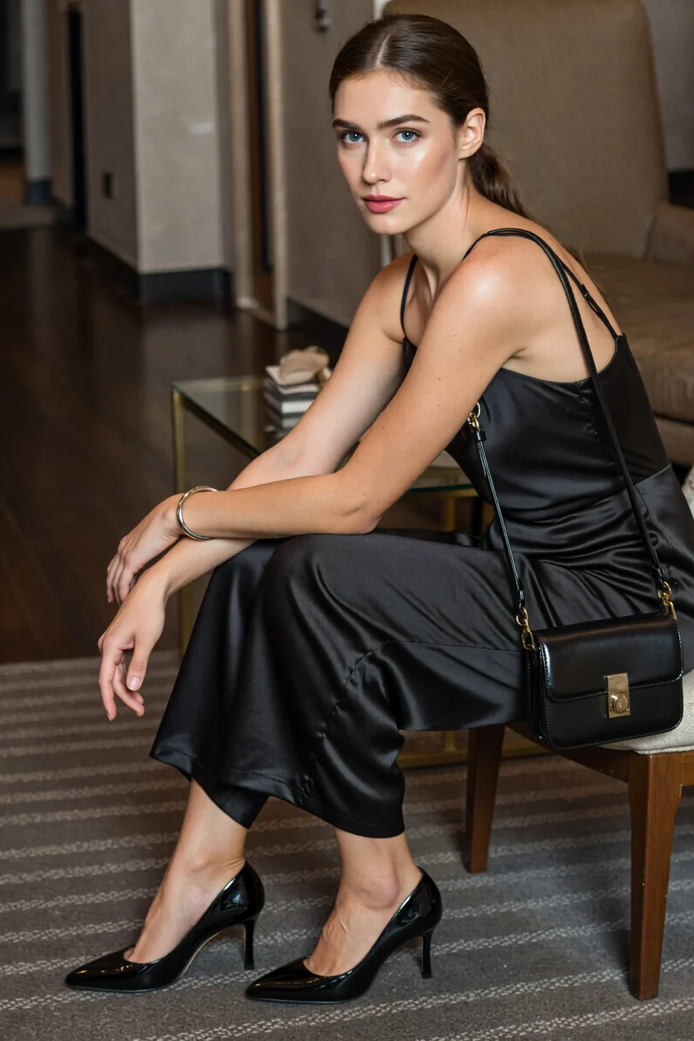 A glossy, red-carpet mood with minimal effort—let the shoes be your statement and the satin do the rest.