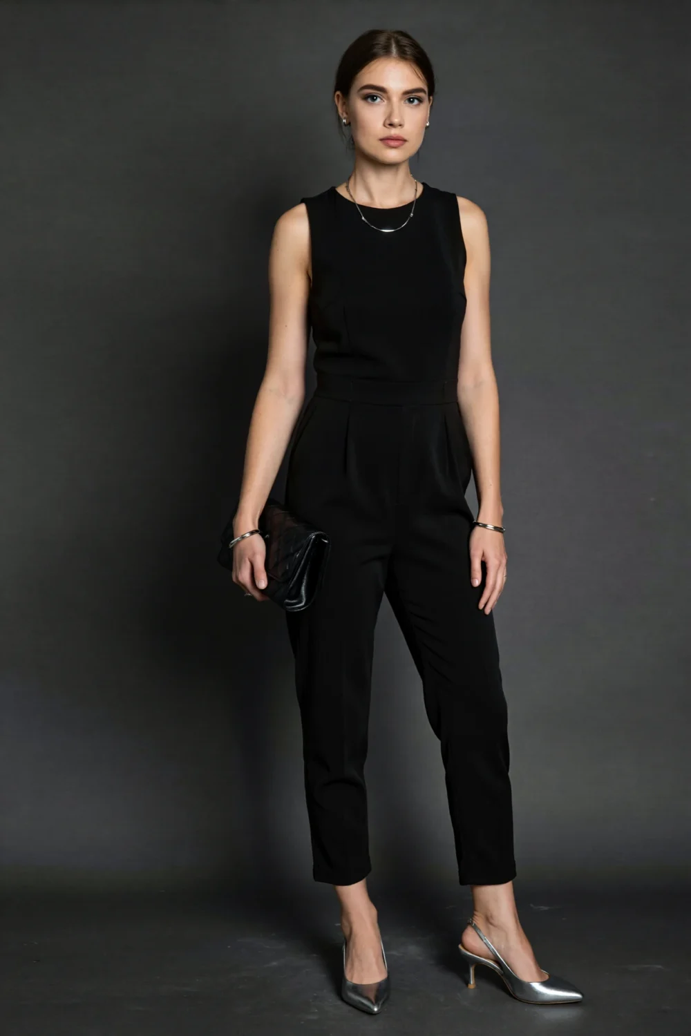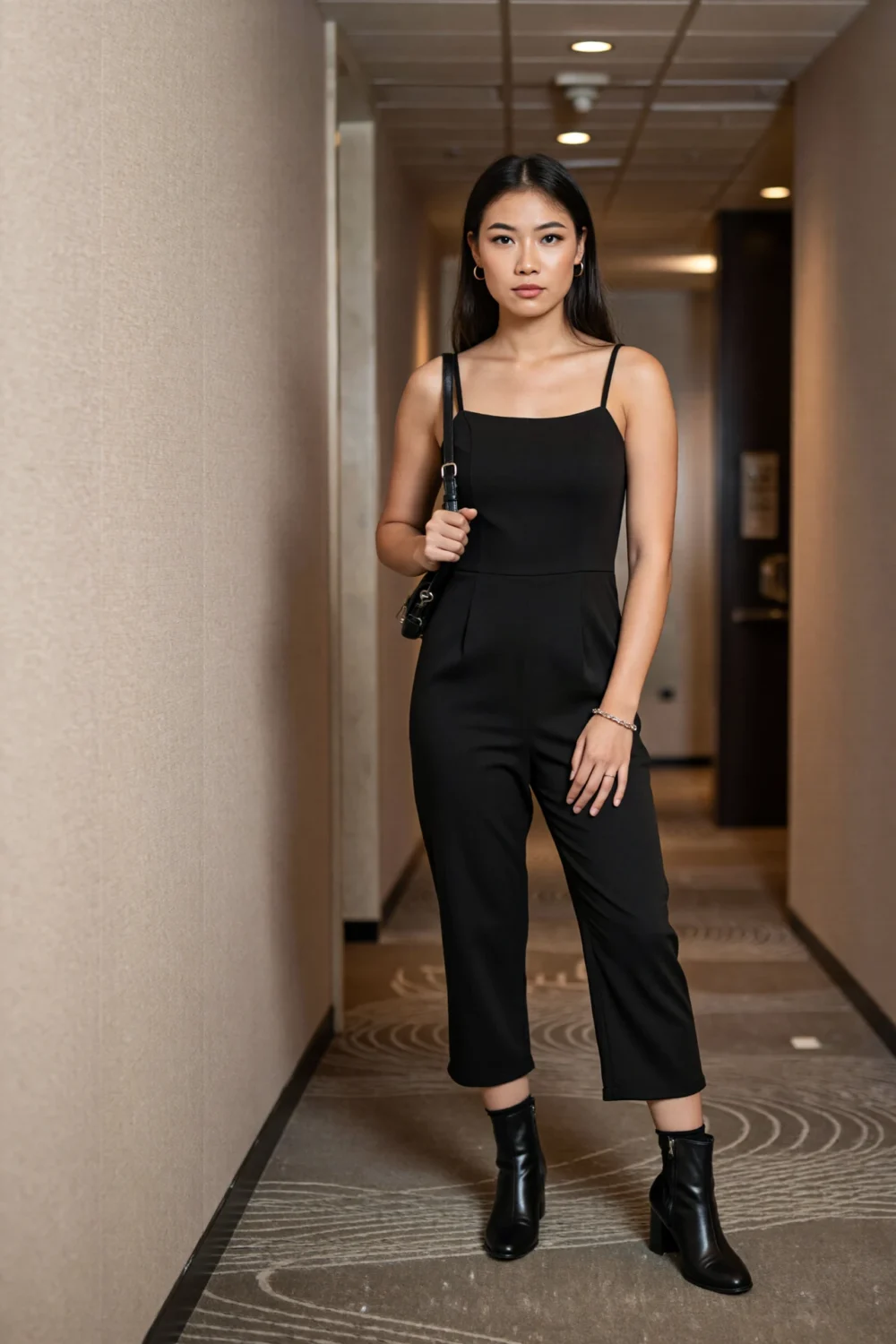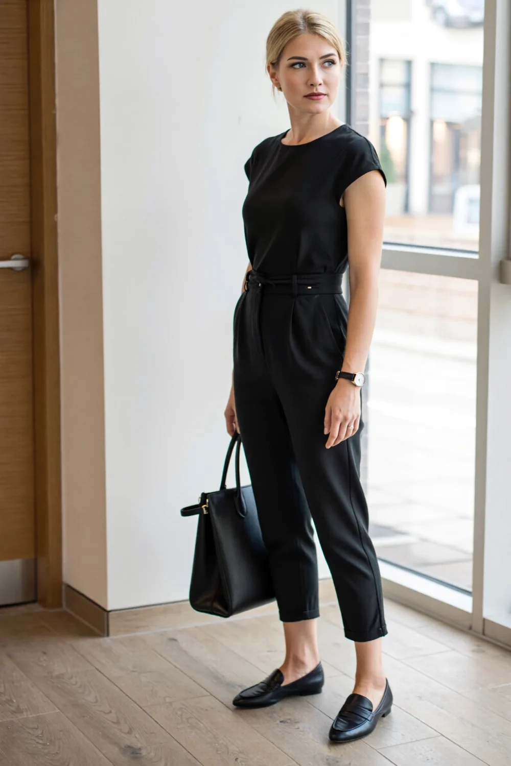 A tailored black jumpsuit plus pointed-toe pumps creates a razor-sharp silhouette. Choose black pumps for a seamless column, nude to lengthen, or metallic for evening sheen. Keep the hem grazing the ankle, add a slim belt, and a structured clutch for crisp polish.