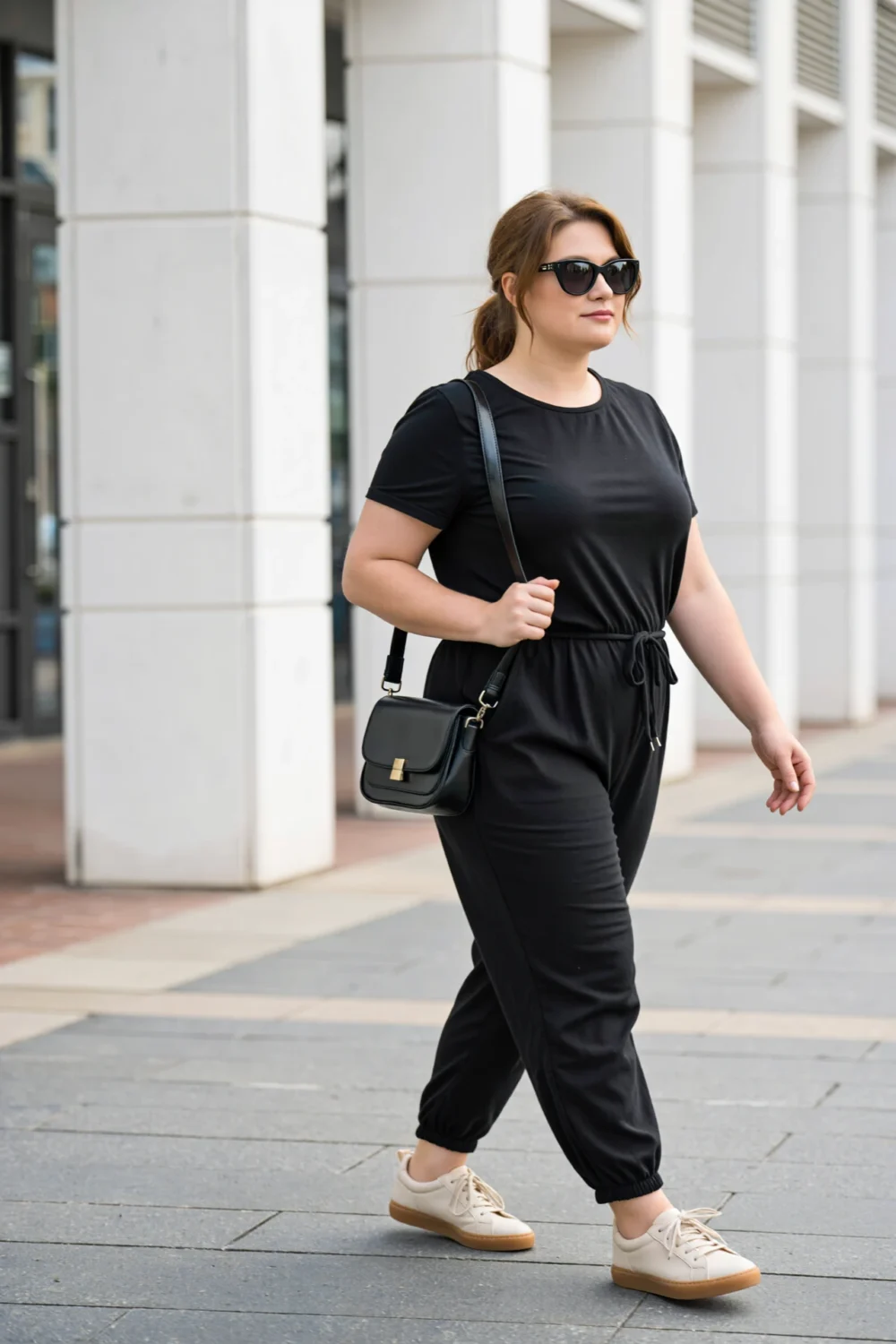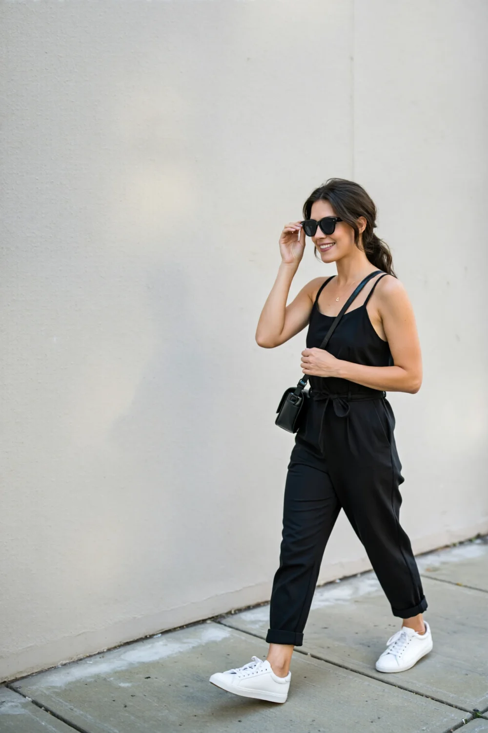 34. Minimalist Sneakers with Casual Black Jumpsuit
