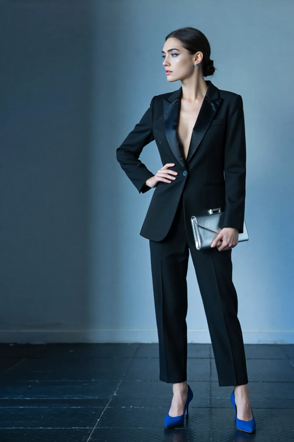 Cobalt or royal blue heels strike a modern contrast against a tuxedo-style black jumpsuit. The saturated hue pops against sharp lines; silver hardware and a minimalist clutch keep things graphic and clean.