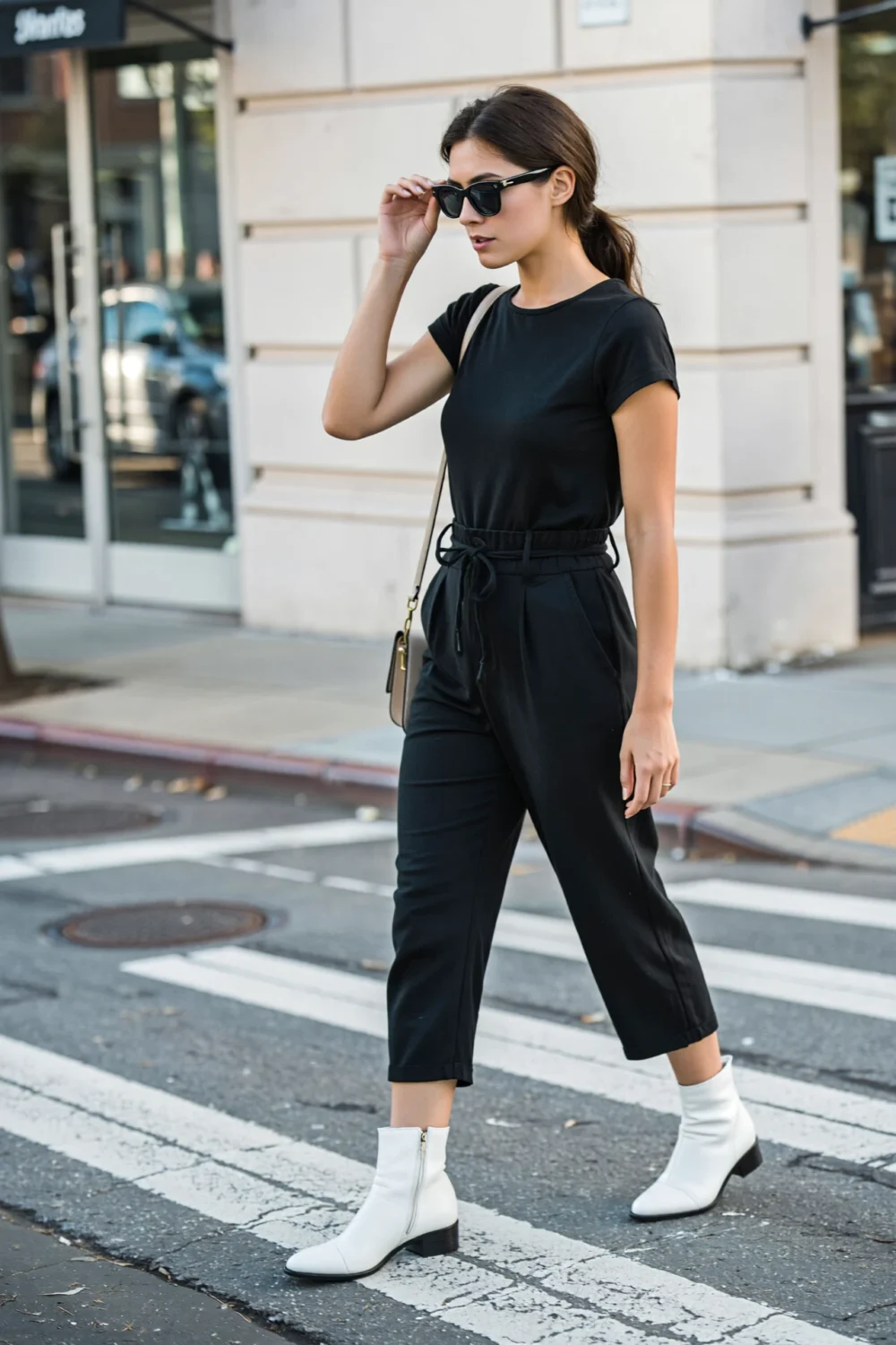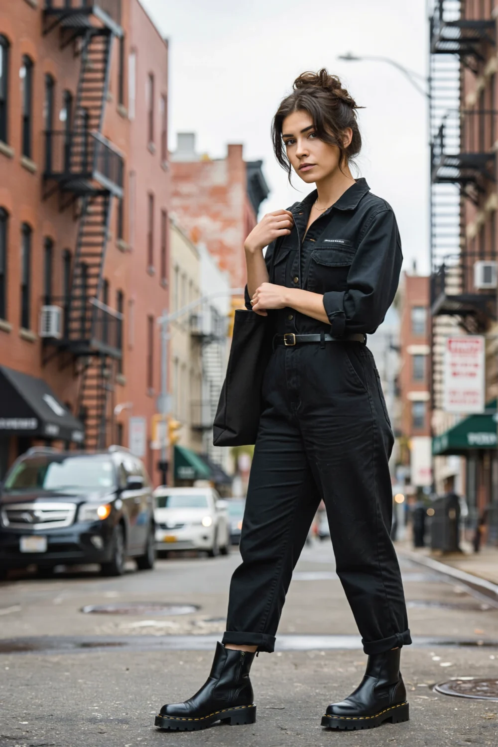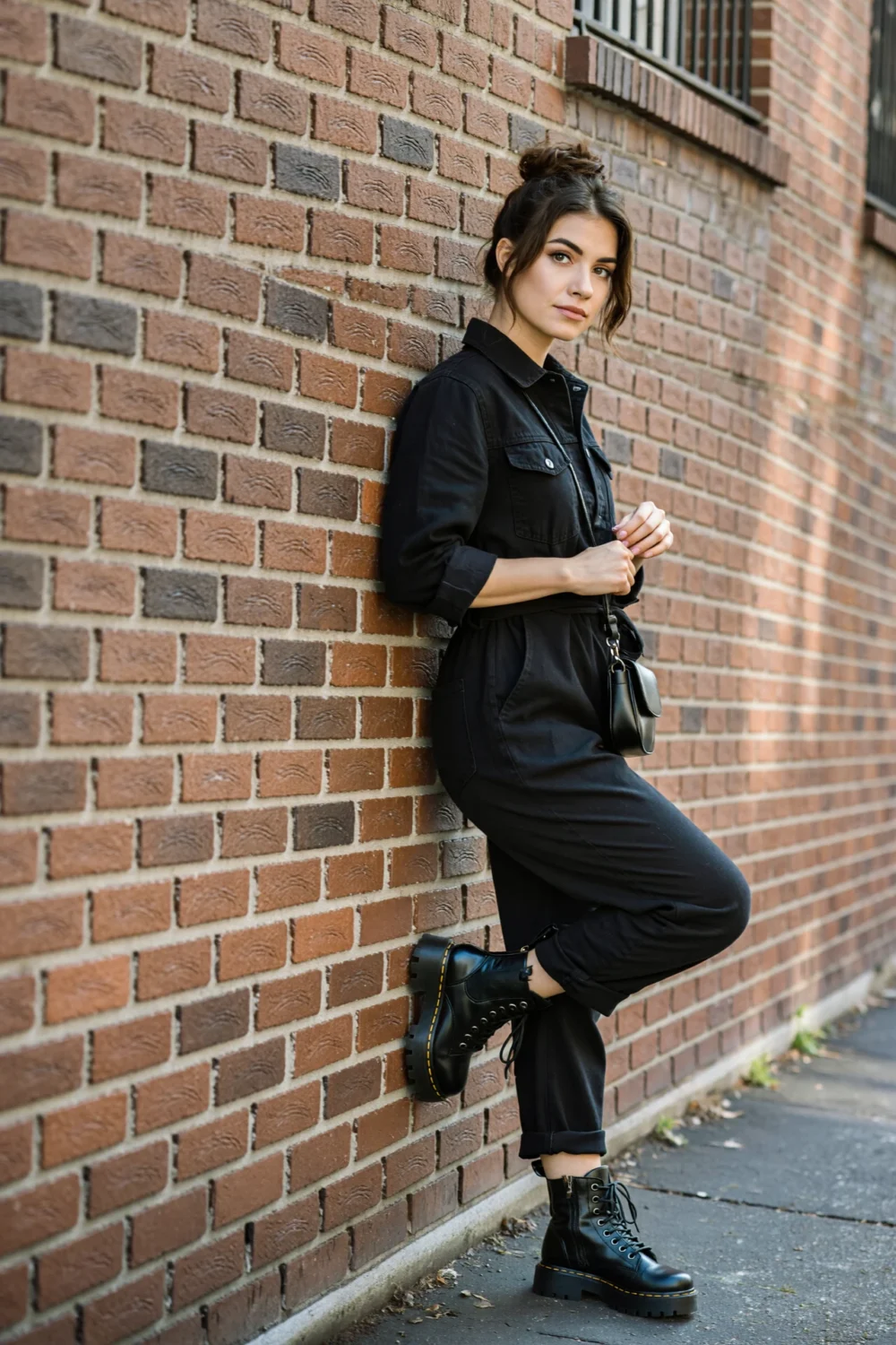 Pointed or almond-toe ankle boots sharpen a straight or cigarette-leg black jumpsuit. Leather or suede works—add a small heel for understated height. The result: a streamlined city silhouette that’s polished without feeling precious.