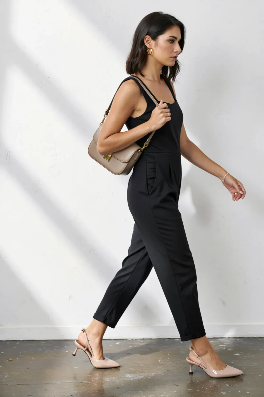 Cropped black jumpsuits feel featherlight with nude pointed pumps. The low vamp and slim heel visually extend the leg, keeping proportions sleek rather than chopped. Minimal jewelry and a neutral crossbody keep everything modern, fresh, and easy for a busy day.