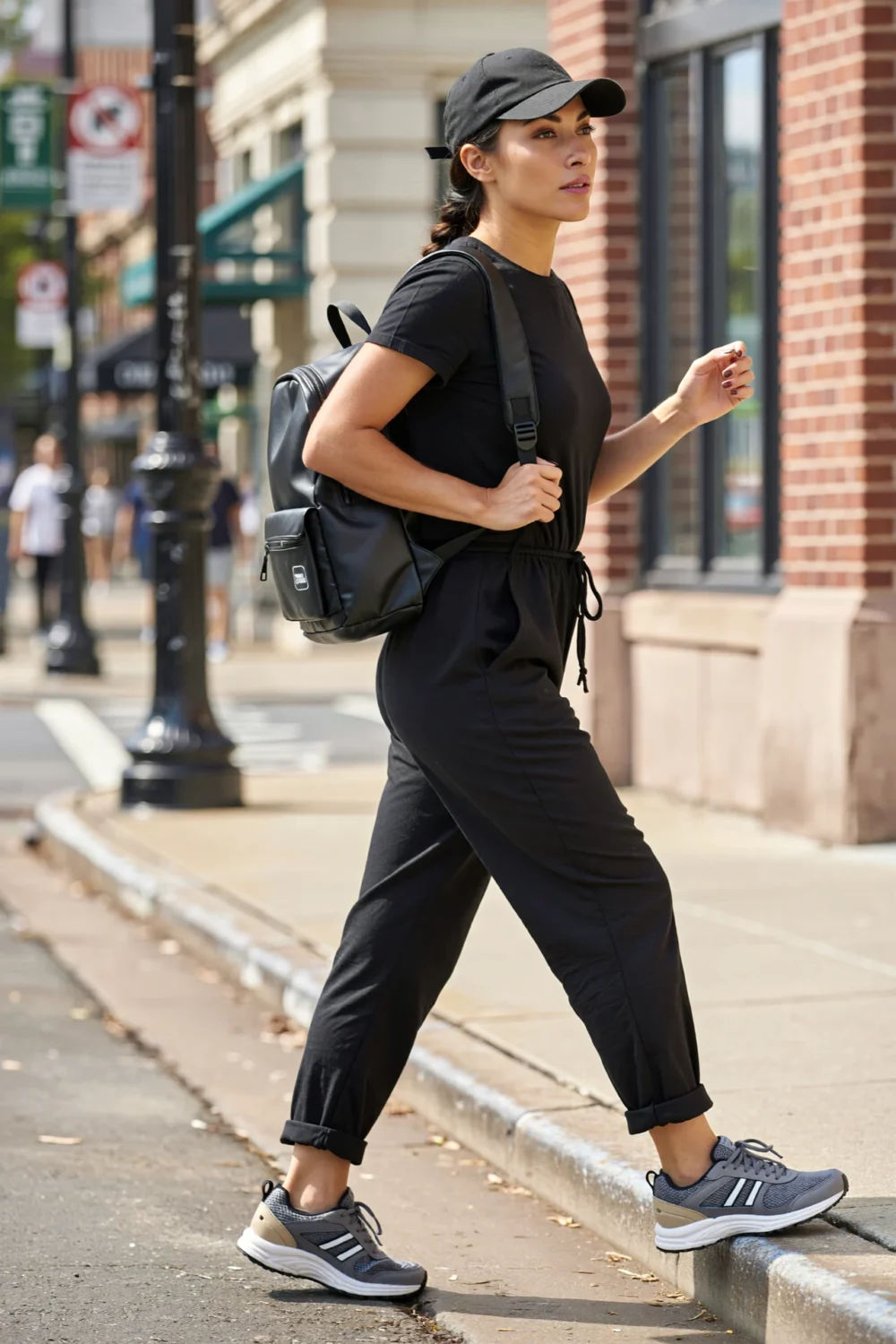 Simple, low-profile sneakers keep a relaxed black jumpsuit clean and modern. Neutral leather or tonal fabric keeps it streamlined. Add a leather crossbody and understated sunglasses for effortless, urban daywear.