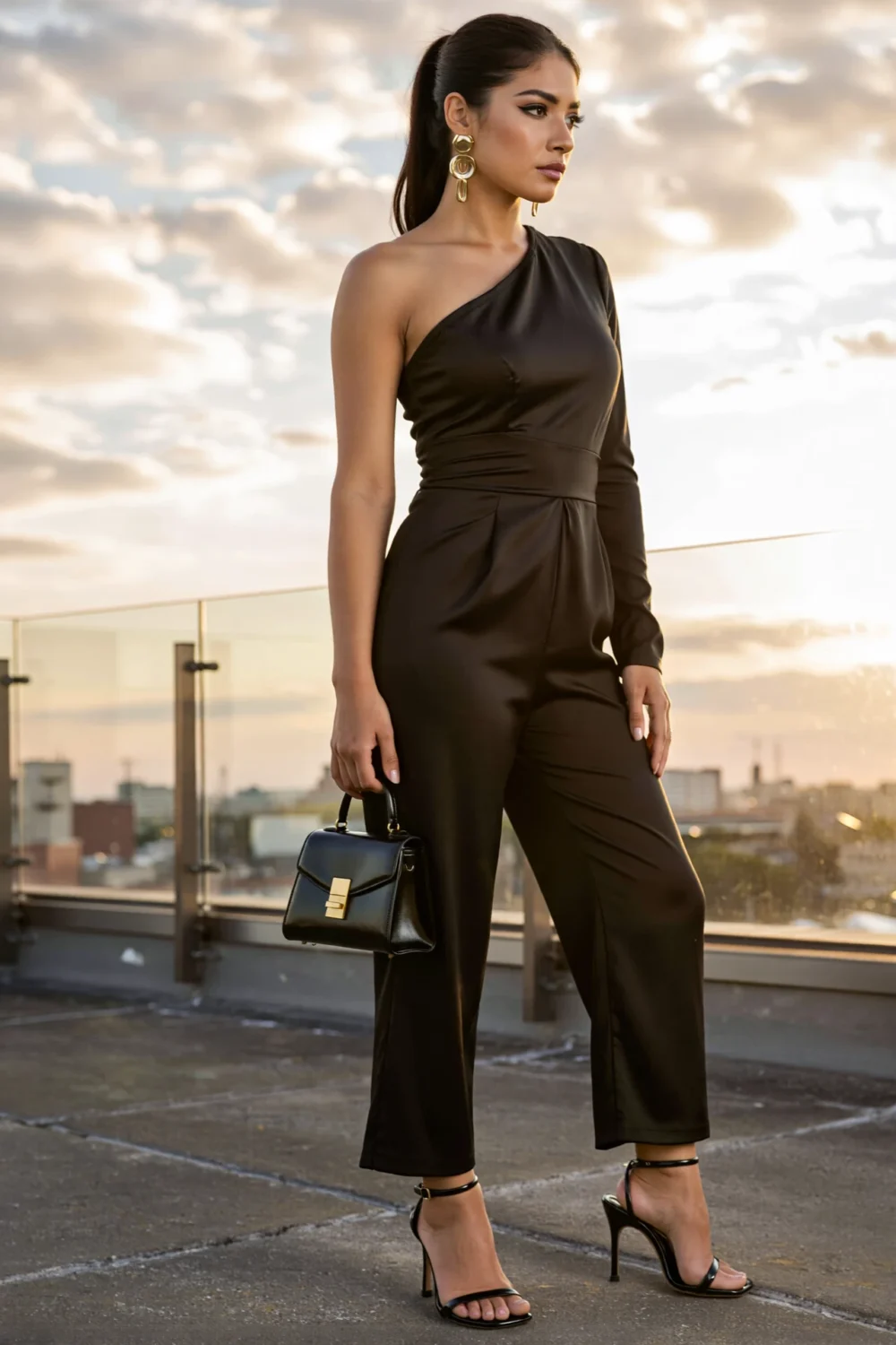 A satin black jumpsuit gleams against metallic pumps—silver, pewter, or gold acting like jewelry at your feet. Delicate straps and a sleek clutch keep the glow chic, while matching metal accents up top draw the eye and elongate the whole look.