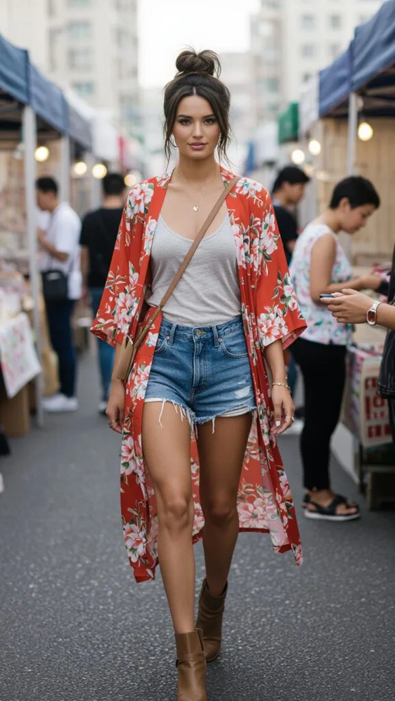Drape a floral kimono over a simple tank and denim shorts for an instant boho upgrade. Pair with ankle boots or strappy sandals for versatility that works day or night. This look is all about effortless layering—light, breezy, and perfect for warm weekends. A crossbody bag keeps your essentials close while you channel your inner wanderer. It’s a twirl-worthy outfit that’s pure Instagram magic.