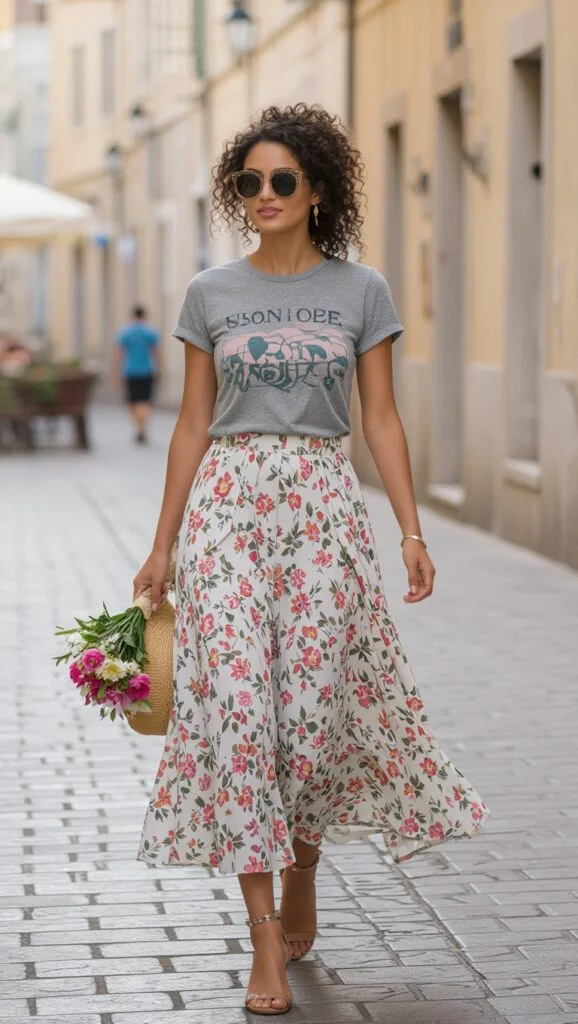 Flowy midi skirts are the unsung heroes of weekend wear. Tuck in a graphic tee for a playful contrast and step into sandals or espadrilles for sunny-day ease. Top it off with a straw hat and oversized sunglasses for that Instagram-worthy flair. This outfit is all about balance—casual yet put-together, with a hint of boho charm. It’s like wearing a vacation, even if you’re just strolling around town.