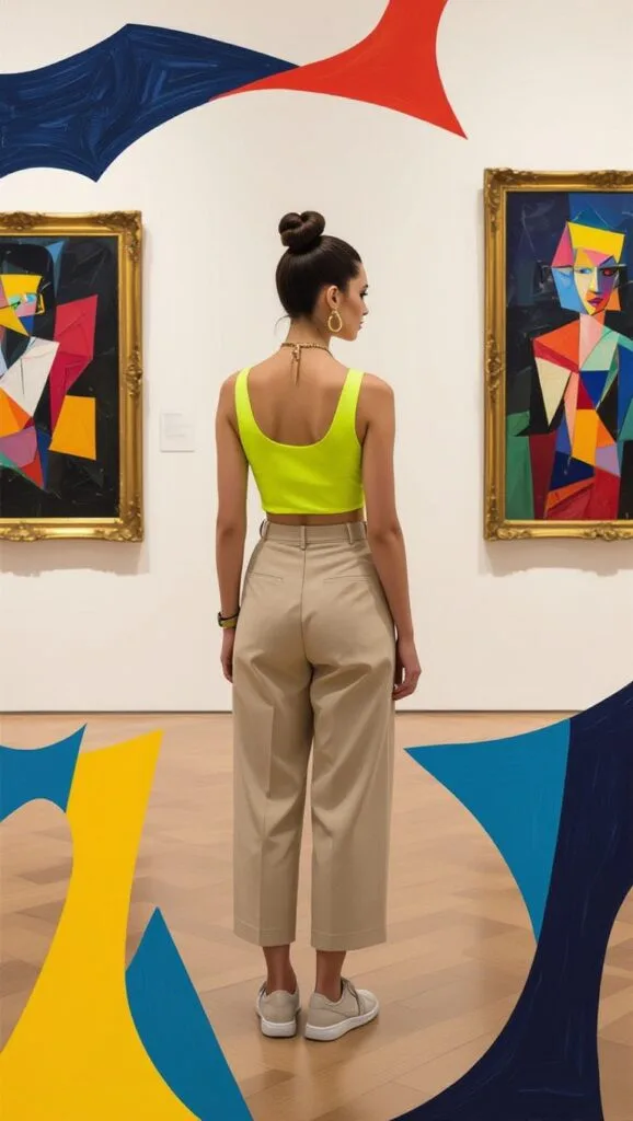 A bright neon top paired with beige trousers is a bold yet balanced choice. Slip into minimalist sneakers for comfort that keeps the focus on the pop of color. Keep accessories simple—a sleek watch or stud earrings—to let the neon shine. This outfit is perfect for a trendy brunch or art gallery visit, offering a fresh take on weekend style. It’s vibrant, comfy, and guaranteed to light up your feed.