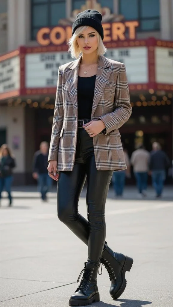 A plaid blazer over stretchy faux leather leggings creates a daring, fashion-forward look. Pair with combat boots for an edgy finish and toss on a beanie for extra cool points. This outfit is ideal for a night out or a concert, blending bold textures with cozy stretch. It’s a vibe that says you’re here to slay. Add a crossbody bag to keep it practical yet chic.