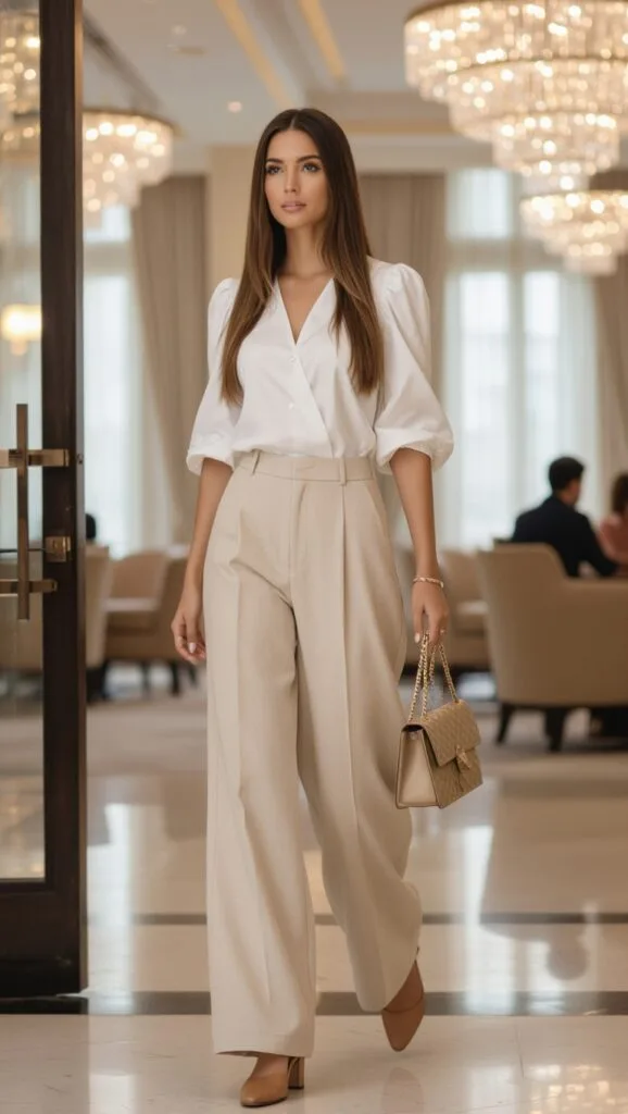 A puff-sleeve blouse tucked into wide-leg trousers screams drama in the best way. Pair with sleek mules for a modern touch and add a chain-strap bag for trendy flair. This look is perfect for a stylish dinner or weekend event, offering comfort with a side of sophistication. The voluminous sleeves add just enough pizzazz to make you feel like a fashion icon.