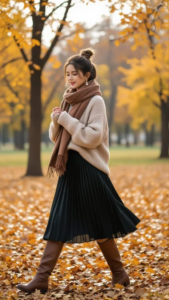 Tuck a cozy sweater into a pleated midi skirt for a warm, elegant ensemble. Pair with knee-high boots or flats for comfort that doesn’t skimp on style. This look is perfect for crisp weekend days, offering a soft yet polished vibe that’s great for brunch or a museum visit. Add a scarf for extra coziness. It’s classic, comfortable, and ready to carry you through any weekend adventure.