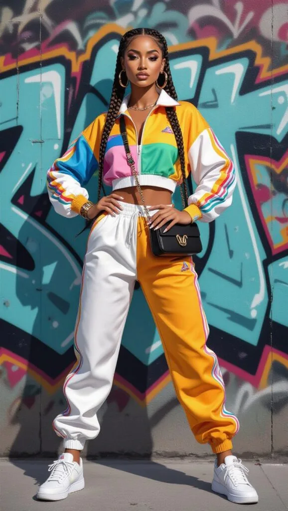 A colorful tracksuit is your athleisure MVP—comfy, bold, and effortlessly stylish. Pair it with crisp white sneakers for a clean contrast and accessorize with a crossbody bag for practicality. Hoop earrings bring a hint of glam to the sporty vibe. This look says, “I’m active… sort of,” and it’s perfect for when you want to feel put-together without the effort. Bonus: tracksuits are great for transitional weather.