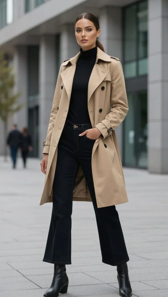 A black turtleneck tucked into straight-leg pants creates a sleek, sophisticated silhouette. Pair with Chelsea boots for a seamless finish, and layer a trench coat for that extra touch of timeless glamour. This outfit is your go-to for cooler weekends or cozy coffee dates, blending warmth with elegance. It’s simple yet striking, proving you don’t need bold colors to make a statement. Minimal effort, maximum impact.