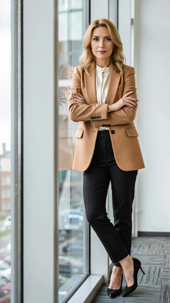 Tailored slacks in gray or pinstripe (outfit #21) elevate your tan blazer for corporate settings, exuding quiet confidence. Mid-rise fits flatter without distracting, per style guides.