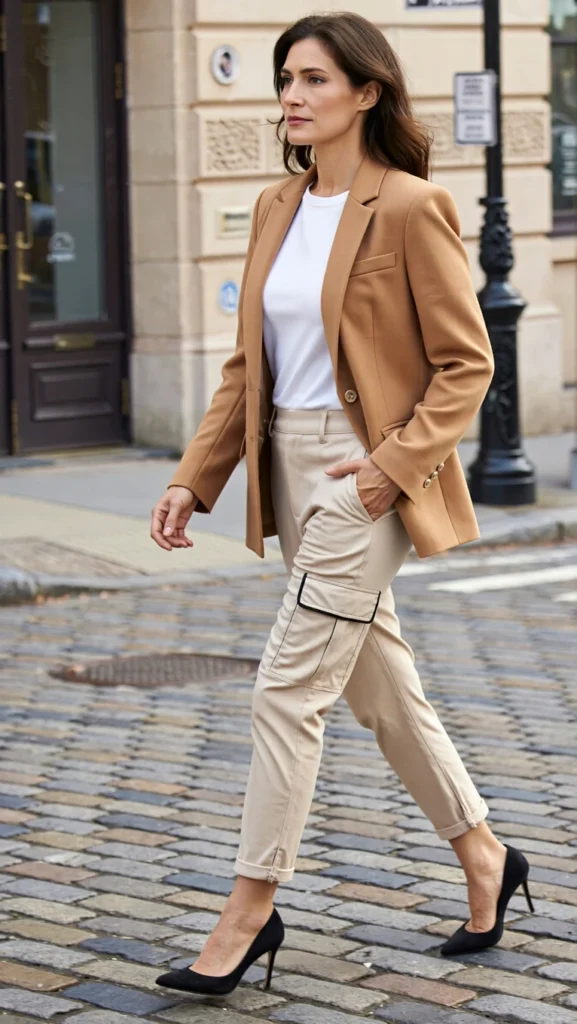 Merge function and fashion with cargo pants under a tan blazer, offering pockets and practicality with a slim fit for modern chic. Add heels and satin trims for a glam touch, perfect for busy days when you want utility without sacrificing refined style.