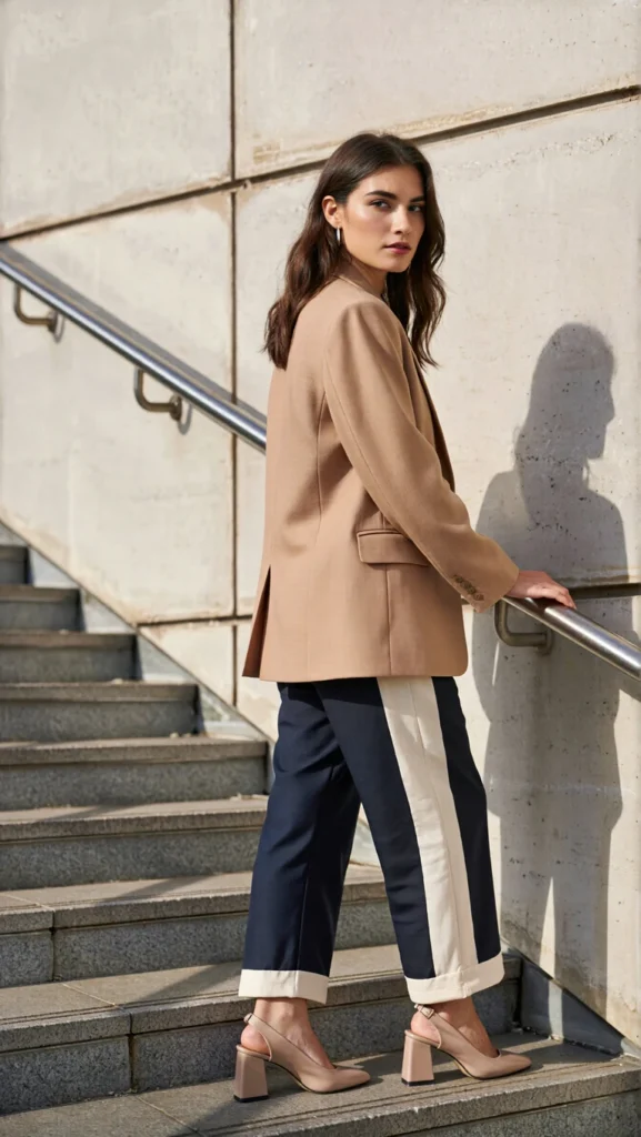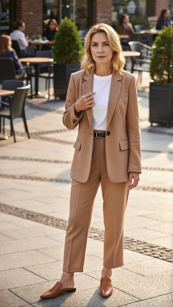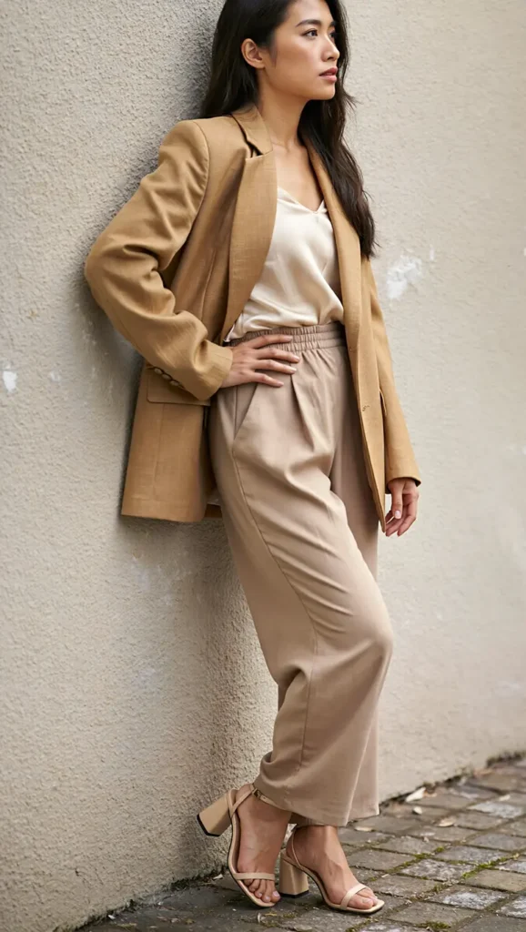 Imagine stepping out in a seamless monochrome look with tonal tan trousers and your blazer, creating an effortlessly elongating silhouette. Add a crisp white tee or a dark belt with pointed-toe mules to subtly break the tone and define your waist for chic, polished harmony.