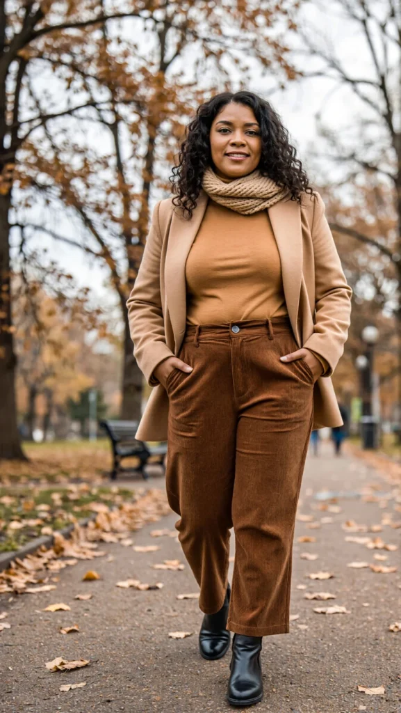 As temperatures drop, corduroy or wool trousers (outfit #19) add warmth under your tan blazer, creating cozy layers without bulk. High-waisted wools cinch for shape, while corduroy’s texture brings tactile interest.
