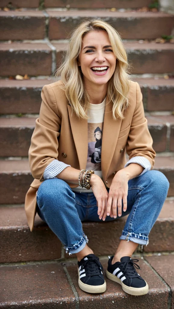 Soften your tan blazer for relaxed weekends with jeans or joggers, blending straight-leg denim edge or cozy softness for downtime style. Add distressed details for personality, creating an effortless, refined casual look that feels like a stylish comfort hug.