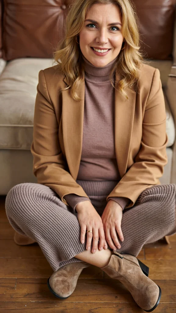 Stay warm without losing shape by pairing soft ribbed knit trousers with a structured tan blazer, ideal for cooler days with a chic layered look. Add ankle boots and a leather belt to contrast the softness, crafting a cozy yet polished ensemble for fall outings.