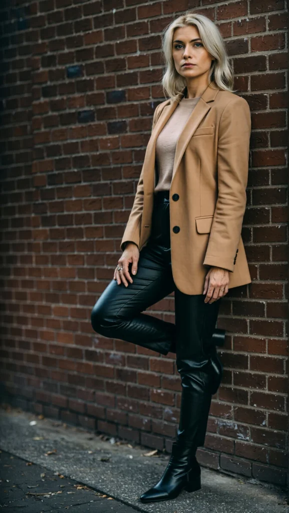 Leather or faux-leather pants (outfit #15) add a rebellious bite to the tan blazer’s softness, creating edgy contrast. Straight-leg faux options keep it wearable, balancing toughness with femininity.