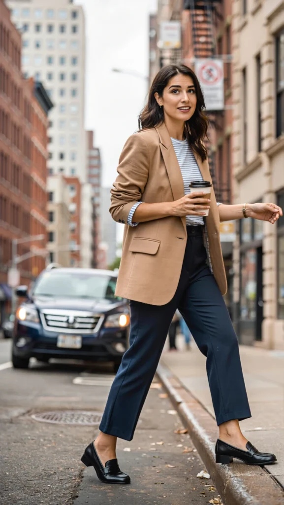 Step into the boardroom with tailored gray or pinstripe slacks inside your tan blazer, exuding quiet confidence for professional settings. Finish with loafers for grounded polish, crafting a look that’s perfect for meetings and corporate environments with effortless sophistication.