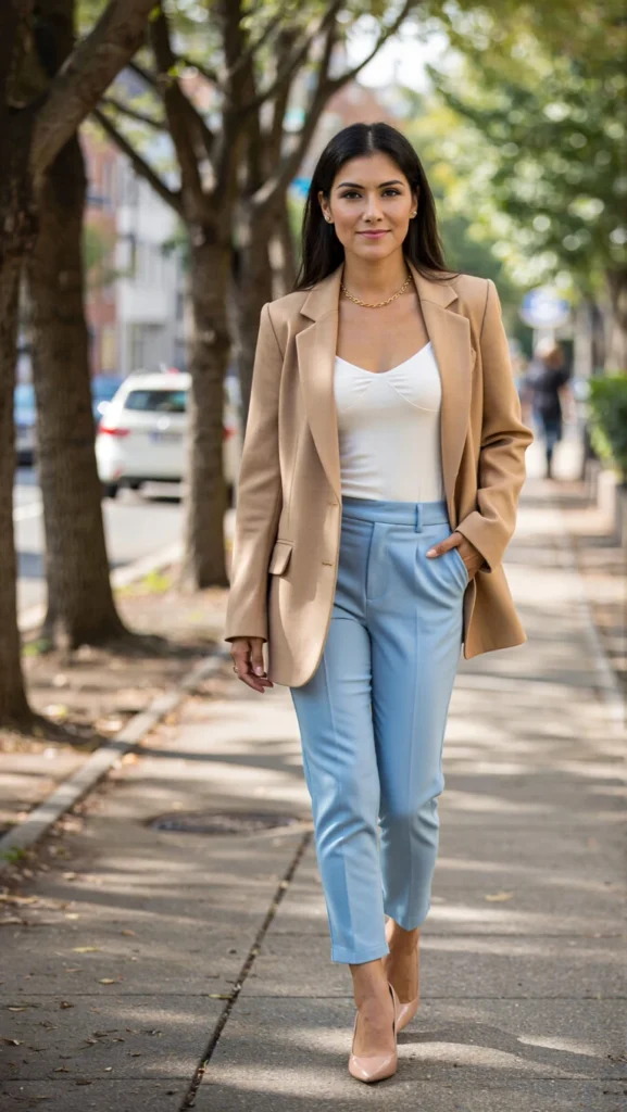 Brighten your day with slim cropped cigarette pants in powder blue or mint, paired with a tan blazer for a fresh, feminine vibe. Tuck in a fitted blouse and slip on nude heels to keep proportions neat, perfect for a polished daytime look that whispers modern charm.
