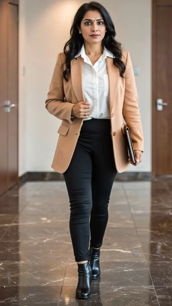 For comfort that doesn’t compromise on elegance, pair high-quality ponte leggings with a longer tan blazer, creating a streamlined everyday look. Button the blazer at the waist over a longline shirt and finish with ankle boots for a sleek, go-anywhere outfit that feels effortlessly put-together.