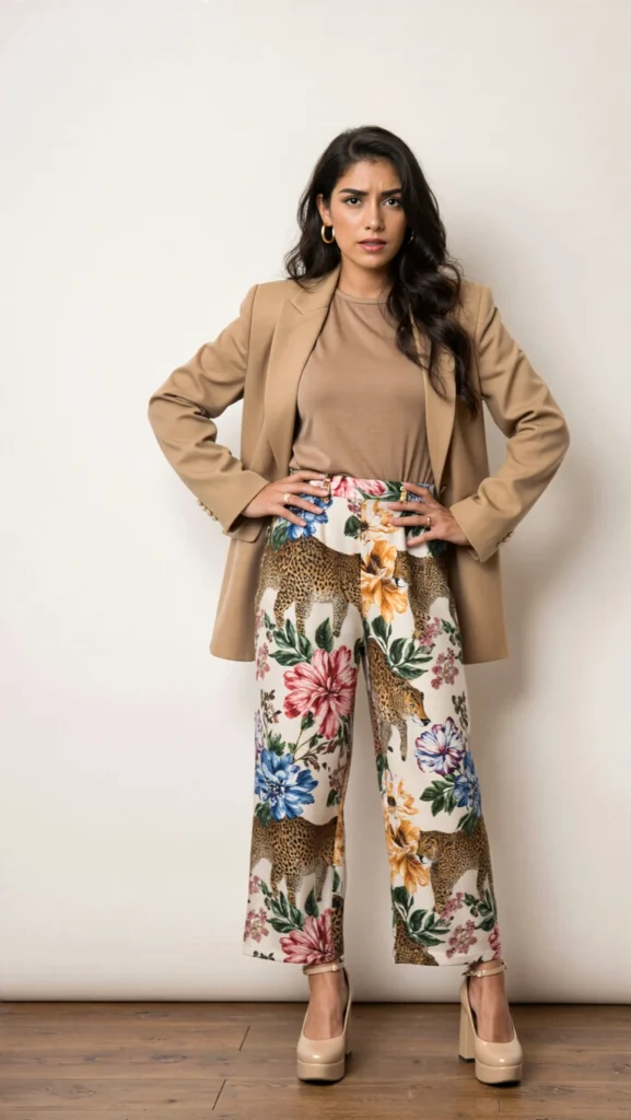 Printed pants (outfit #16) bring personality to tan blazer outfits, from subtle stripes to bold florals that whisper rather than shout. Animal prints add a wild touch, tempered by the blazer’s neutrality.