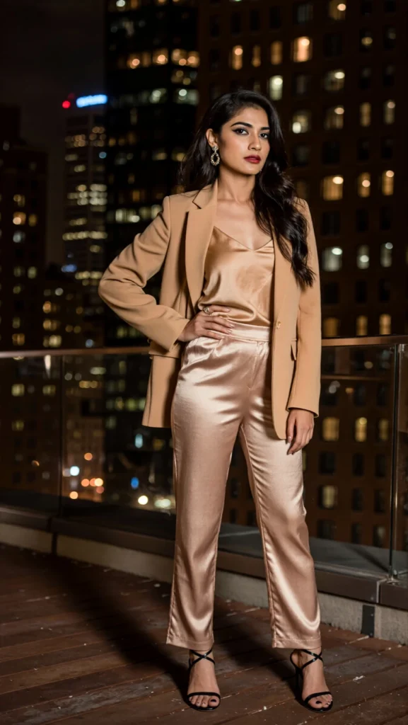 Satin or sequined pants (outfit #23) amp up the drama with a tan blazer, perfect for nights that sparkle. Slim fits hug curves, creating sultry silhouettes.