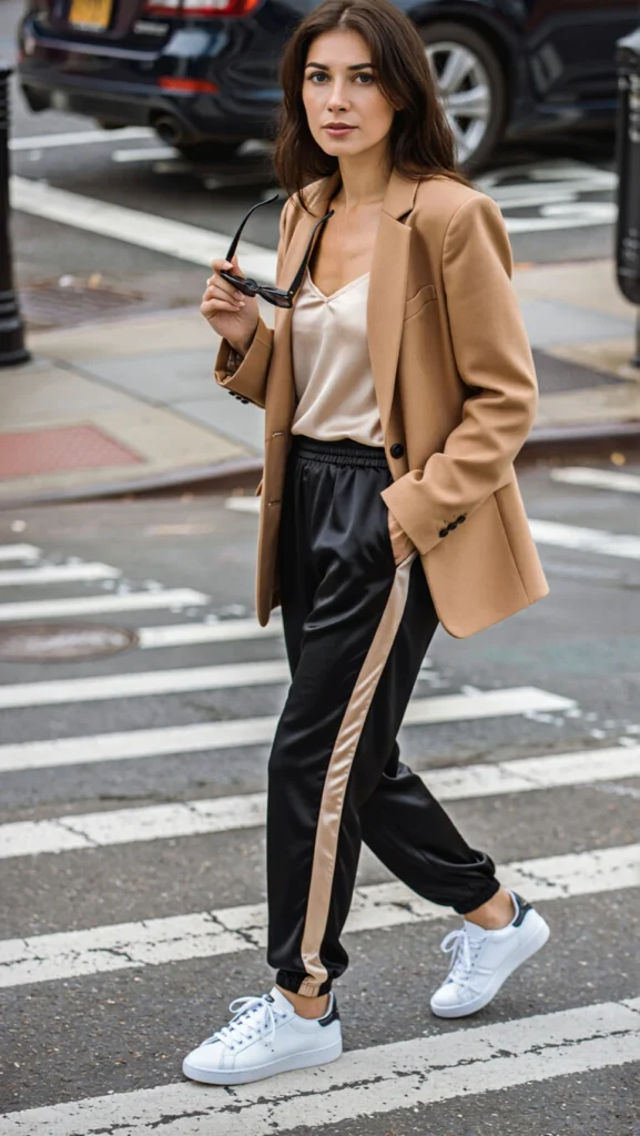 Transform your tan blazer into sporty-luxe territory with streamlined track pants featuring a satin side stripe, blending comfort with metropolitan polish. Pair with a silk cami and sleek trainers for a trendy, on-the-go outfit that’s perfect for casual city adventures.