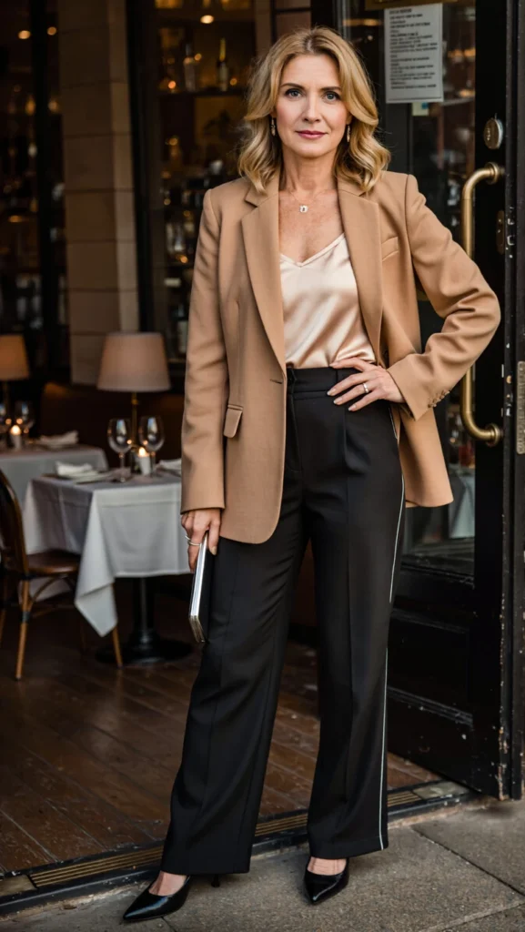 Elevate your evening style with tuxedo pants featuring a subtle satin side stripe, turning your tan blazer into modern, feminine suiting for cocktail events. Pair with a delicate camisole and pointed-toe heels for tailored glamour that shines at dressy dinners or special occasions.