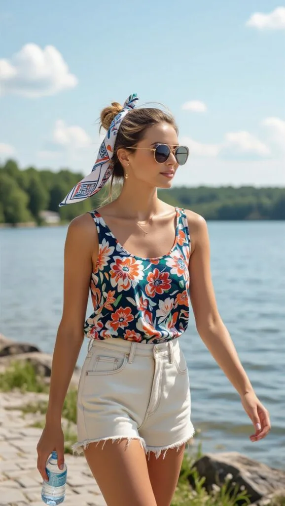 Strut along the shore in high-waisted shorts and a bold tank top, with a scarf-tied hair accent. This laid-back combo is your go-to for casual lake days with a trendy twist.