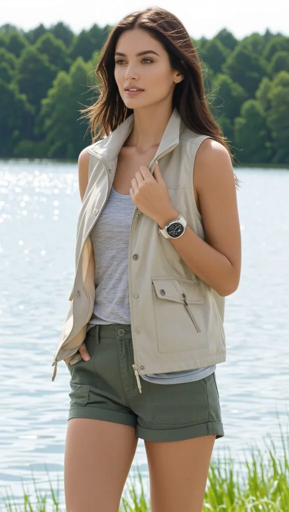 Stroll lakeside in a lightweight vest over a tank top and shorts, with a waterproof watch. This transitional look is effortlessly trendy for any lake adventure.