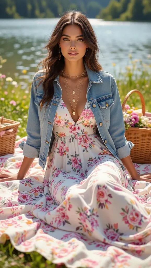 Lounge on a picnic blanket in a floral maxi dress, softened with a denim jacket. This dreamy pastel look is your picnic-perfect ticket to lakeside romance.