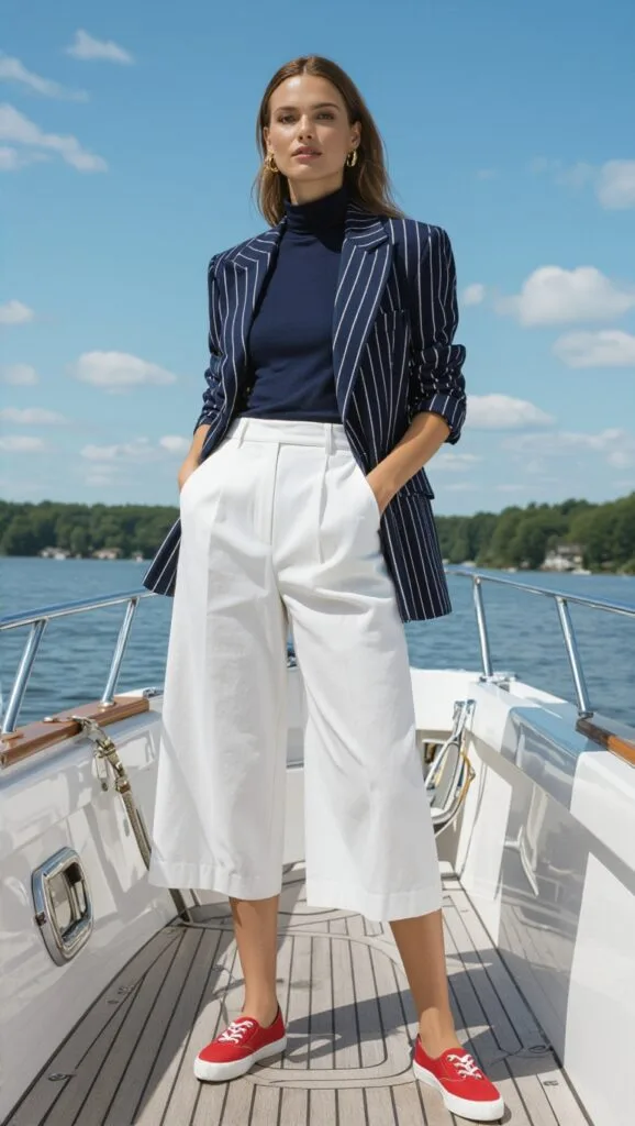 Sail in a navy turtleneck, white culottes, and a striped blazer, with red deck shoes. This modern nautical outfit is effortlessly cool for lake-bound journeys.