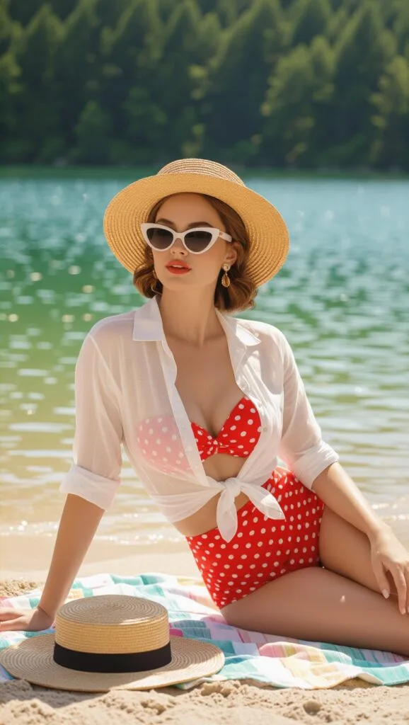 Lounge lakeside in a cherry red polka-dot bikini under a knotted white shirt, with cat-eye sunnies and a straw hat. This retro-chic vibe is perfect for sipping lemonade by the water.