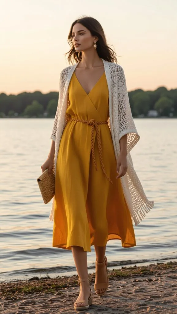 Glide along the lake at sunset in a mustard yellow midi dress with an ivory shawl and espadrilles. This elegant ensemble captures golden-hour romance with effortless grace.