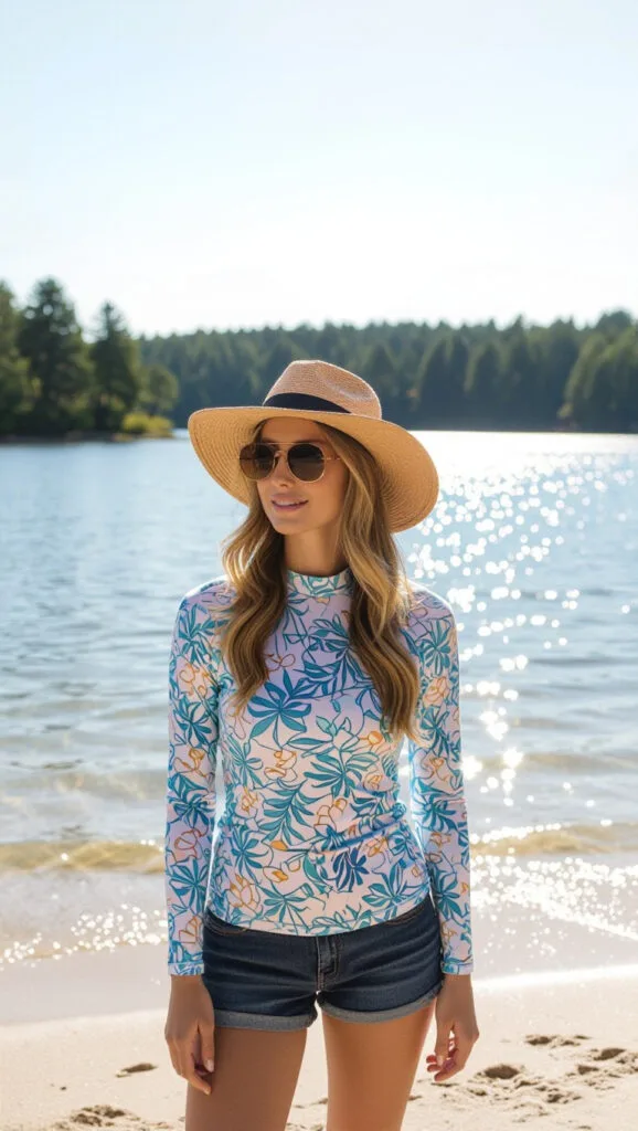Soak up sun safely in a UV-protective rash guard, paired with a stylish sun hat and sunglasses. This chic, sun-smart look is ideal for bright lake days.