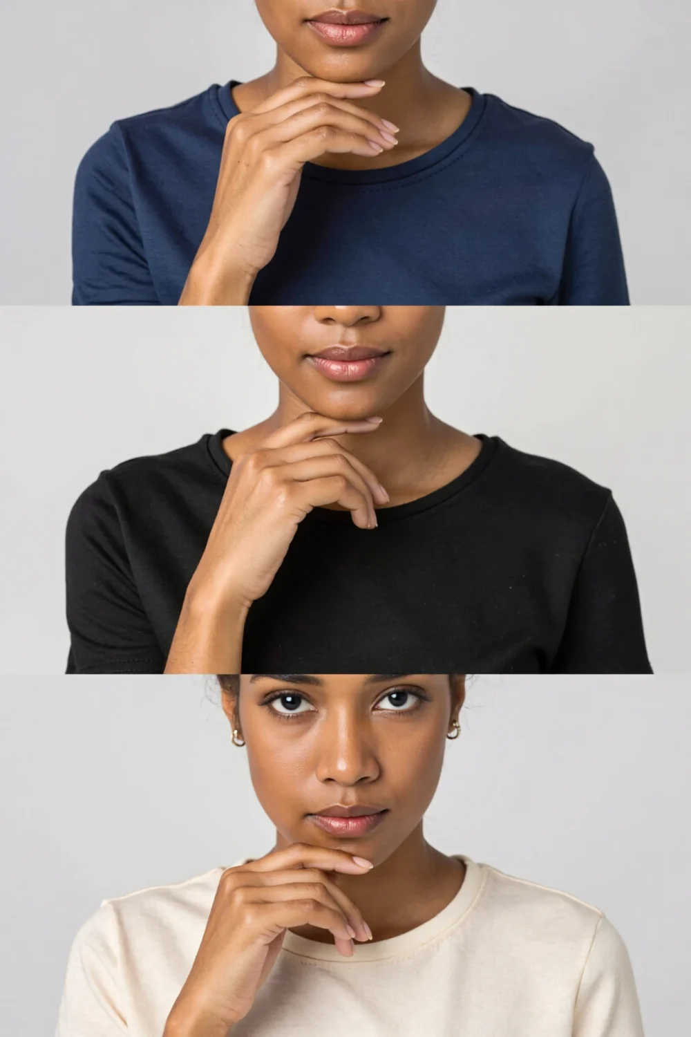 Dive into sophisticated neutrals like black for sleek edge, navy for subtle depth, or cream for warm glow—these tops let your face command the frame against any background, crafting approachable looks that exude quiet confidence and timeless appeal.