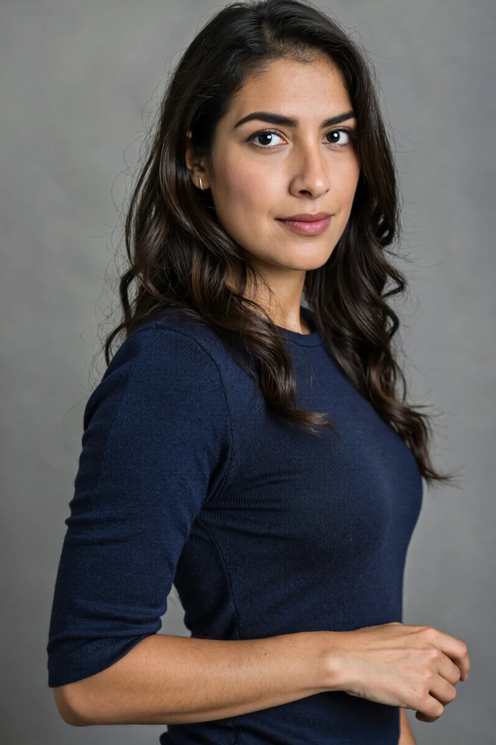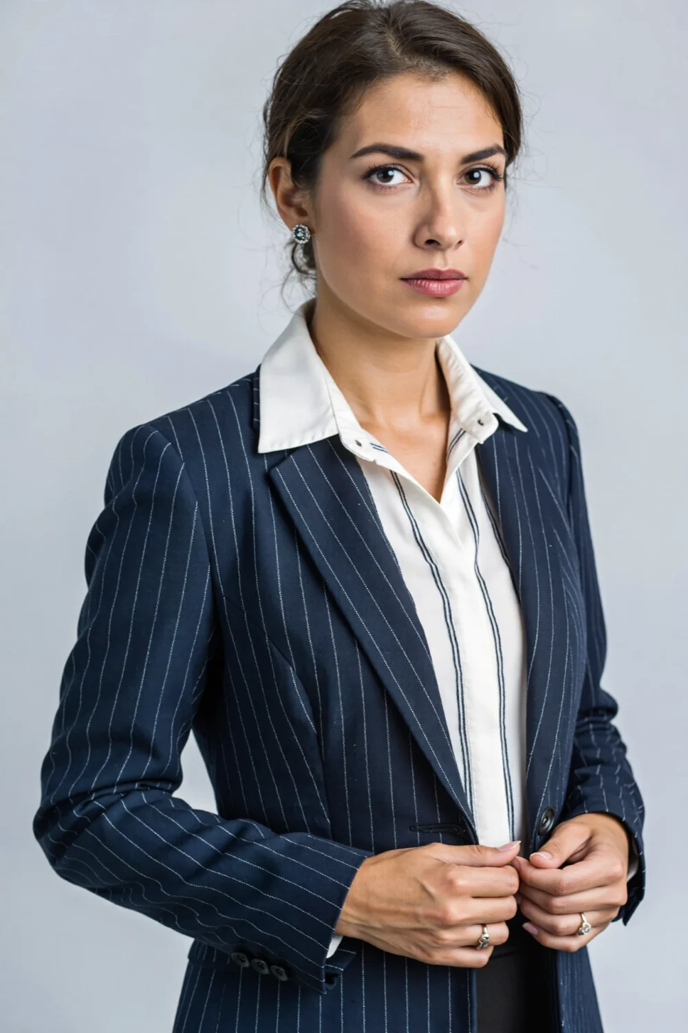 Project authority in a power suit of tailored navy blazer over crisp white blouse with subtle pinstripes, paired with pearl studs for elegant poise; this corporate classic turns headshots into approachable icons of quiet ambition and timeless style.