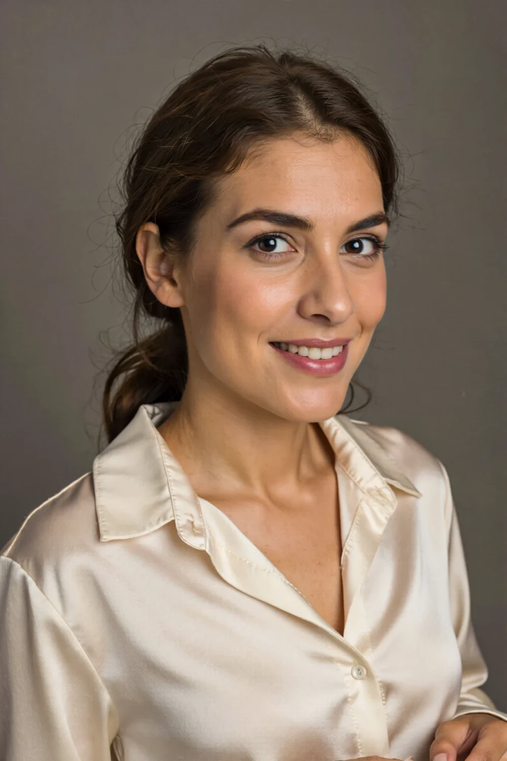 Imagine slipping into a silky button-up in classic white or soft ivory, where the fabric drapes like a gentle whisper over your collarbone, drawing eyes upward with effortless polish. It’s perfect for minimalist luxury that flatters every curve in your next headshot session.