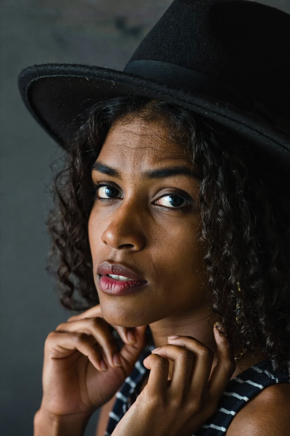 A wide-brim fedora offers artistic drama for creative headshots, but tilt it back to reveal your expression fully.