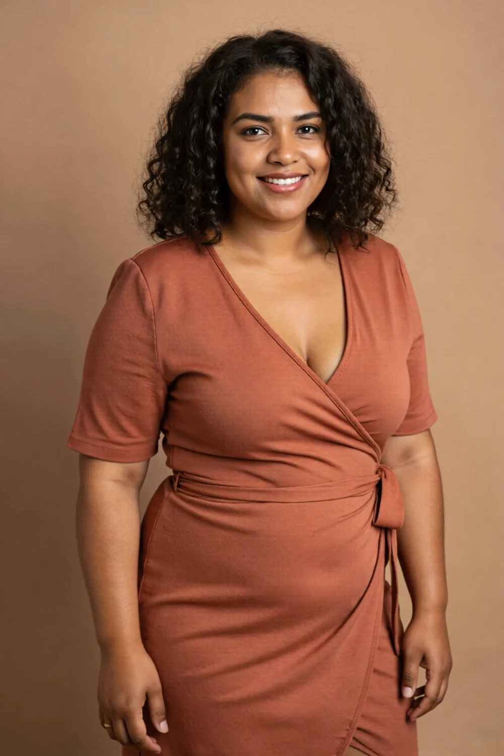 Define your waist in a belt-cinched wrap top with a narrow belt, accentuating curves without frame-cutting distractions. This subtle tweak crafts polished headshots that feel tailored and feminine, evoking quiet confidence in every angle.