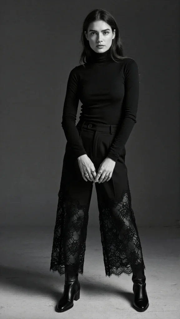 20. All-Black Lace-Trimmed Trousers with Turtleneck