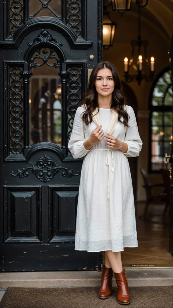 Stepping into a candlelit service calls for outfits that whisper grace and respect. Choose modest midi dresses (outfit #3) in deep jewel tones like emerald or sapphire, which nod to holiday traditions without overwhelming the serene atmosphere. Layer with a tailored wool coat for that extra shield against the winter nip—elegance meets practicality, right?