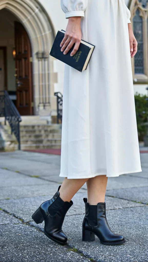 Add edge to serene dresses for midnight mass with ankle boots in rich leather. This practical yet refined pairing ensures you’re stylishly grounded for the sacred night.