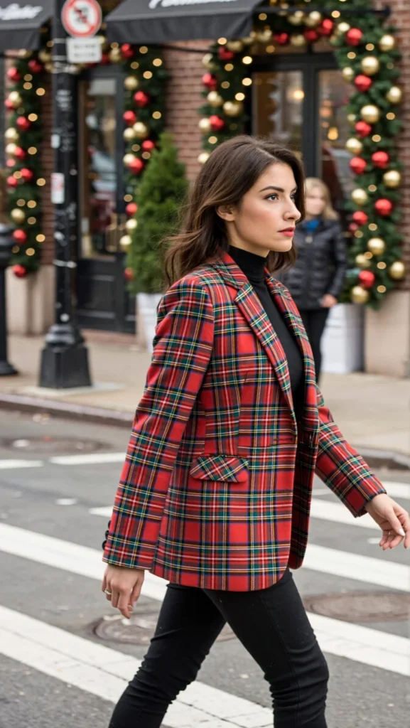 Make a statement this Christmas Eve with a bold plaid blazer over slim pants, sticking to a cohesive palette for harmony. This patterned piece shines as the star of your festive outfit.