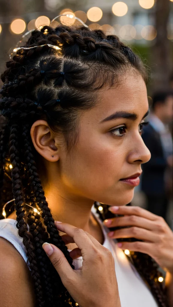 Try loose waves with a texturizing spray for beachy ease, an elegant updo twisted with ribbons for sophistication, or braided accents woven with tiny lights for whimsical fun.