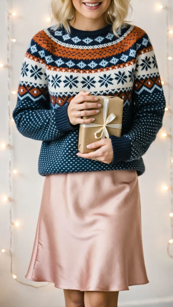 Envision a whimsical night in a fair isle sweater over a satin skirt, mixing cozy patterns with glossy fabric. This warm, playful combo is perfect for family nights by the glowing tree.
