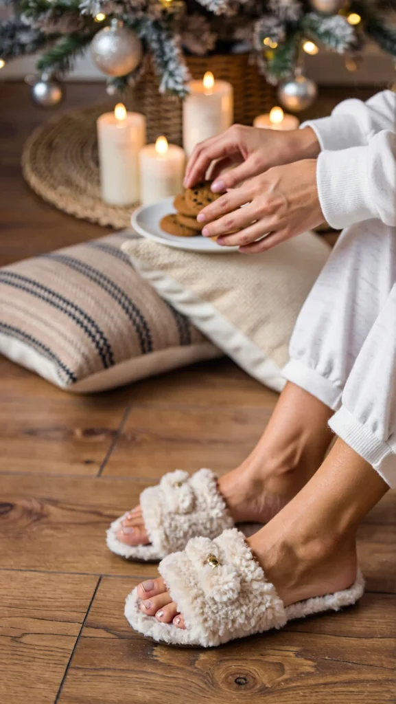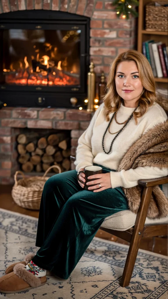 Imagine curling up by the fire on Christmas Eve, wrapped in a plush cashmere sweater in soft ivory, paired with luxurious wide-leg velvet pants. Add fuzzy slippers, a beaded necklace, and faux fur throws for a hygge vibe that’s pure comfort with a hint of sparkle.