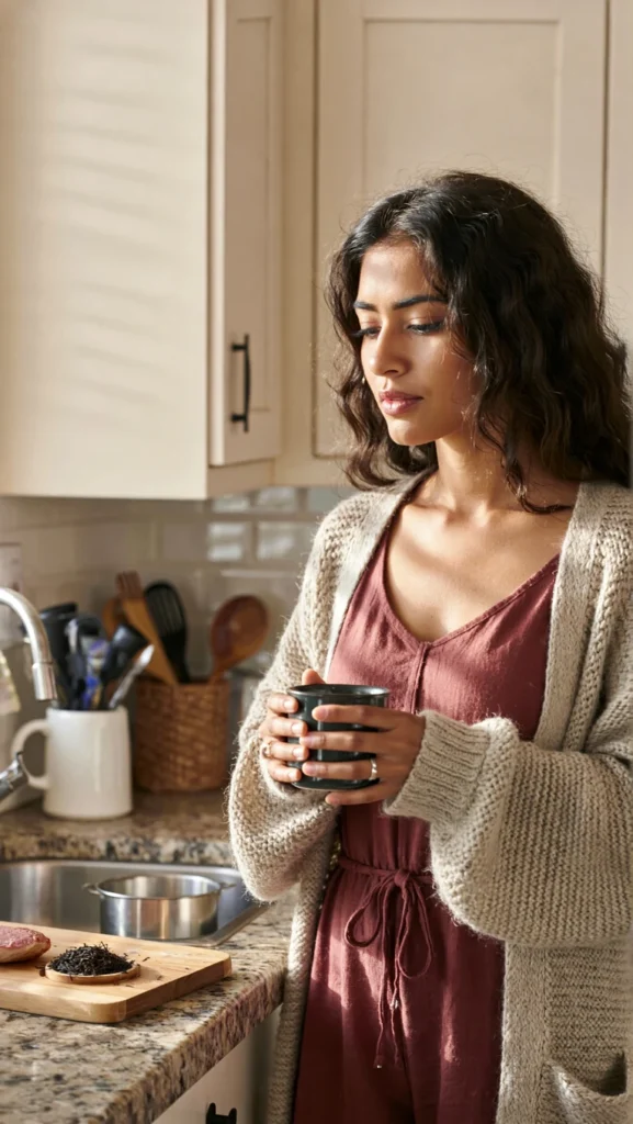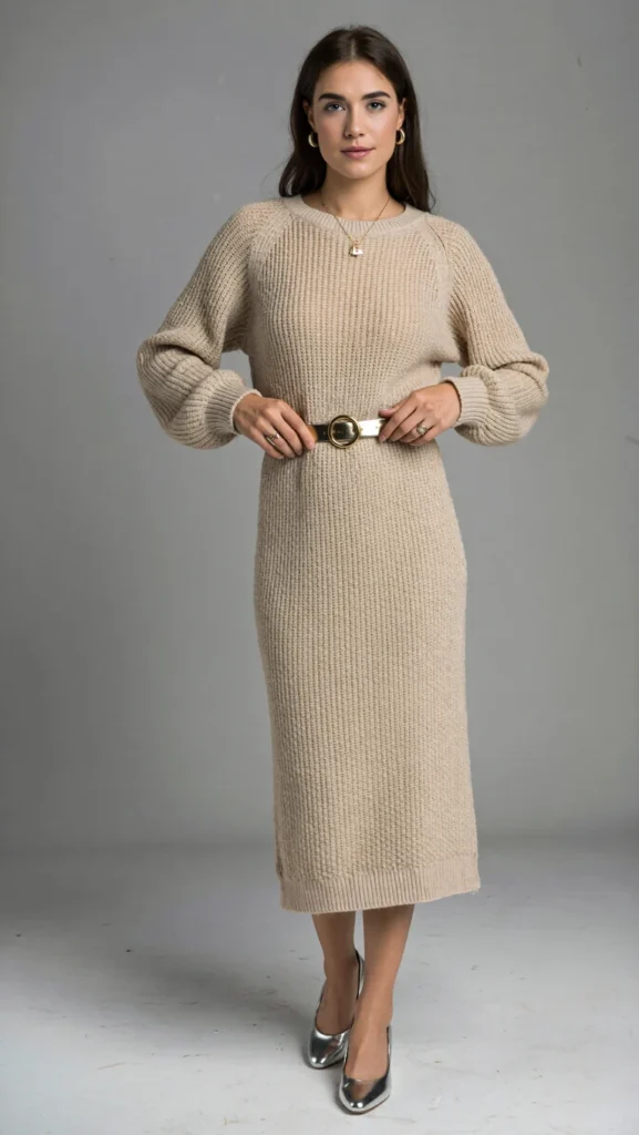 If your home setup includes kids or pets, opt for stain-resistant fabrics in forgiving shades. A simple cable-knit dress over leggings (outfit #2) offers versatility, transitioning from day to evening seamlessly.